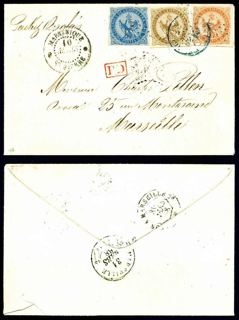 3797 imageAigle, affranchissement tricolore (10c bistre + 20c bleu +40c orange) obl losange de points et cachet circulaire bleu sur lettre du 10 mars 1868 au départ de St Pierre à destination de Marseille, SUP (certificat) Qualité: Oblitéré (Image)