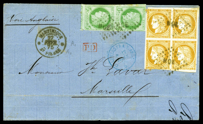3800 image10c bande de 3 + 40c Aigle obl losange 'MQE' + càd de St PIERRE le 10 juin 1864 et càd rouge COLONIES FRA sur lettre pour Marseille par voie d'Angleterre. TTB (certificat) Qualité: Oblitéré (Image)