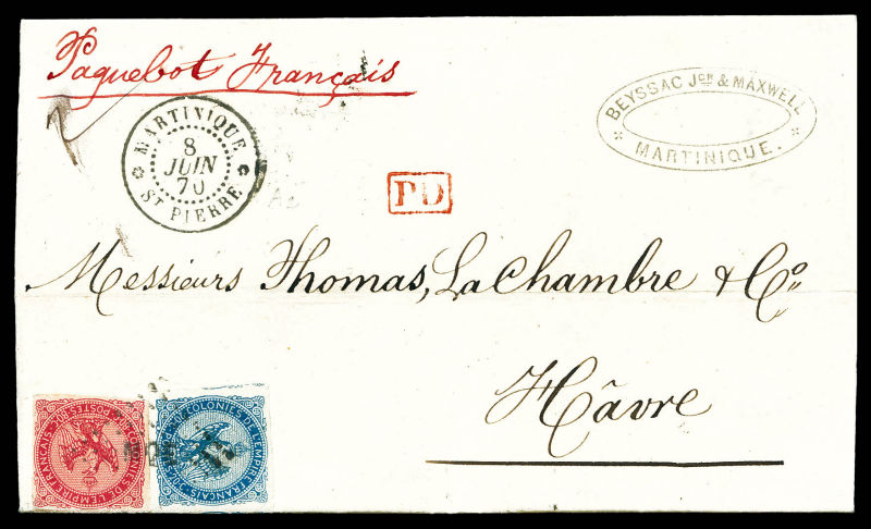 3799 image20c + 80c Aigle obl losange 'MQE' + càd de St PIERRE le 8 juin 1870 sur lettre avec mention manuscrite/Paquebot Francais pour Le Havre. TTB (certificat) Qualité: Oblitéré (Image)