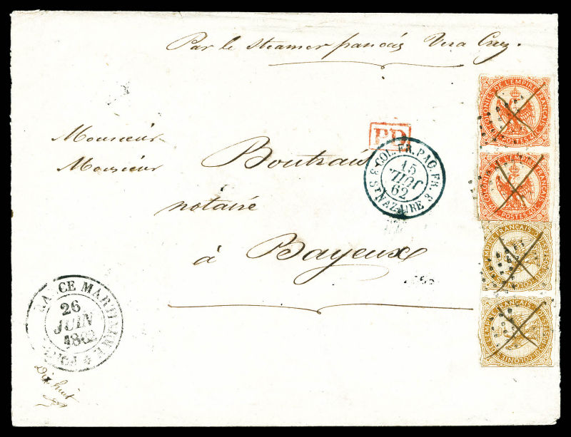 3801 imageAigle 10c bistre en paire (pd) + 40c orange en paire, tarif Martinique-France par voie Mexicaine sur lettre double port de ST PIERRE le 26 juin 1862 pour Bayeux. TTB (certificat) Qualité: Oblitéré (Image)
