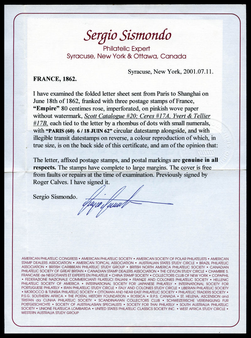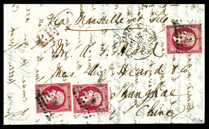 385 imageN°17B, 80c rose, 3 exemplaires obl losange + càd de PARIS le 18 juin 1862 sur lettre à destination de SHANGHAI (CHINE), cachets de Transit au verso. TTB (signé Calves/certificats) Qualité: Oblitéré (Image) (image2) (All Images)