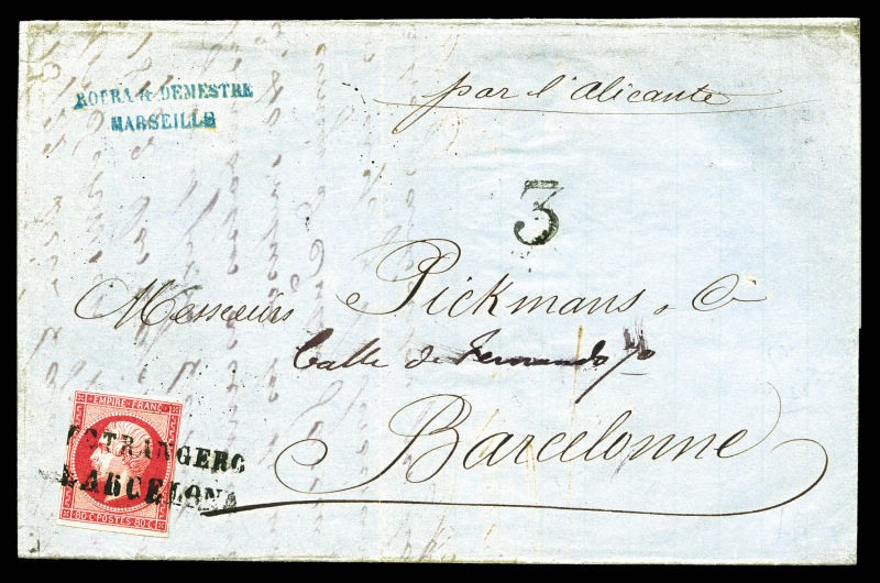 386 imageN°17B, 80c rose Obl 'ESTRANGERO BARCELONA' sur lettre avec annotation 'par alicante'+ taxe '3' au départ de Marseille le 18 avril 62 pour Barcelone, arrivée le 30. SUP (certificat) Qualité: Oblitéré (Image)