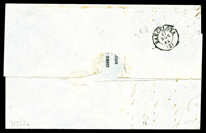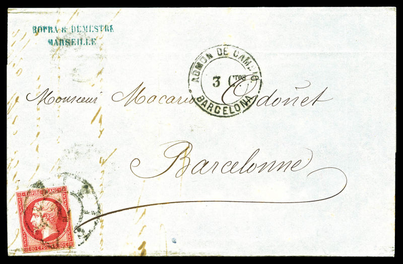 387 imageN°17B, 80c Empire Non dentelé oblitération Espagnole 'ROUE DE CHARETTE' sur lettre double port de Marseille pour Barcelone, très grande rareté sur 80c non dentelé. SUP (certificat) Qualité: Oblitéré (Image) (image2) (All Images)