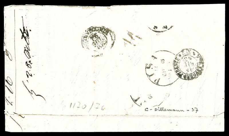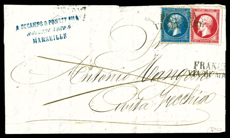 388 image1863, 80c Empire non dentelé et 20c dentelé sur lettre double port à destination de CIVITA-VECCHIA obl 'FRANCIA VIA DE MARE', SUP (signé Brun/certificat) Qualité: Oblitéré (Image) (image2) (All Images)