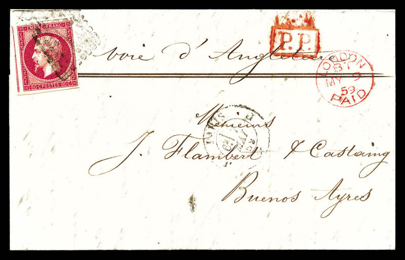 389 imageN°17B, 80c Empire obl 'DS2' + càd de PARIS sur lettre du 7 mai 59 à destination de BUENOS AIRES via Londres. TTB (certificat) Qualité: Oblitéré (Image)