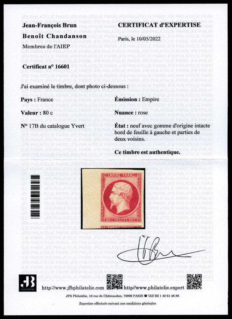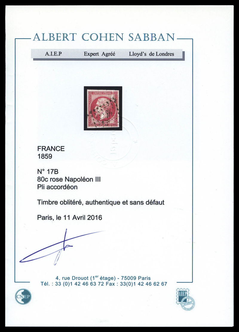 383 imageN°17B, 80c rose, forte charnière, frais. TB (signé Calves/certificat) Qualité: * Cote: 3800 euros (Image)