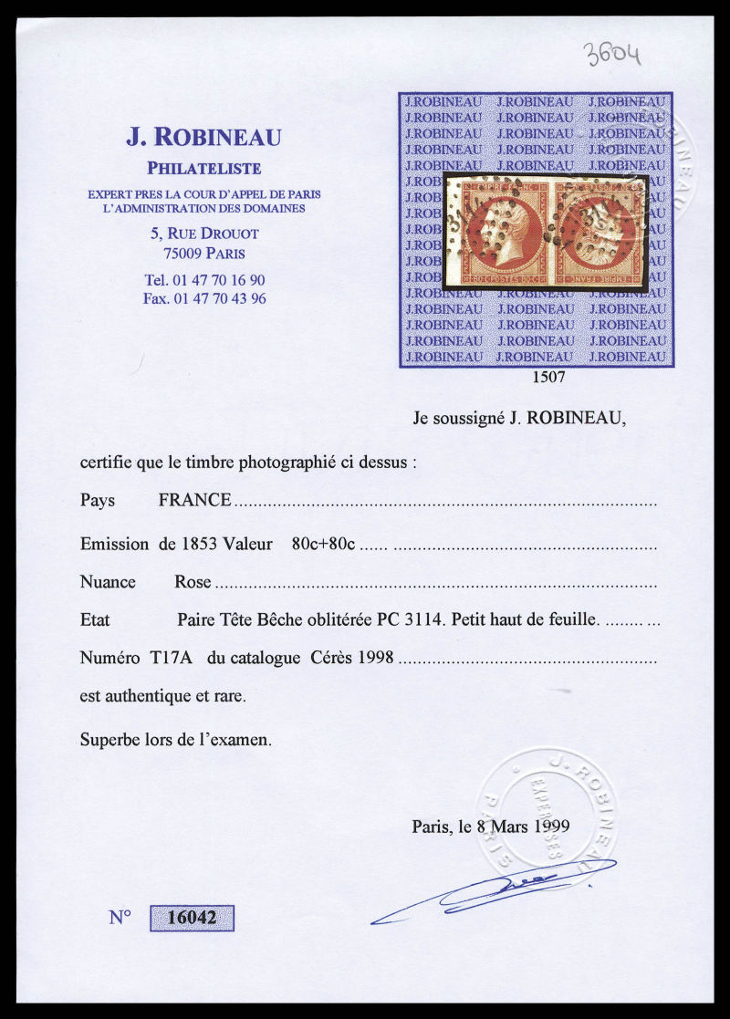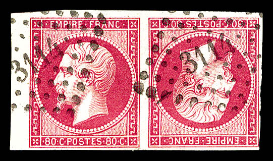 392 imageN°17Bc, 80c rose en paire tête-bêche petit bord de feuille obl pc 3114. SUPERBE. R.R. (signé Brun/certificats) Qualité: Oblitéré Cote: 15500 euros (Image) (image2) (image3) (All Images)