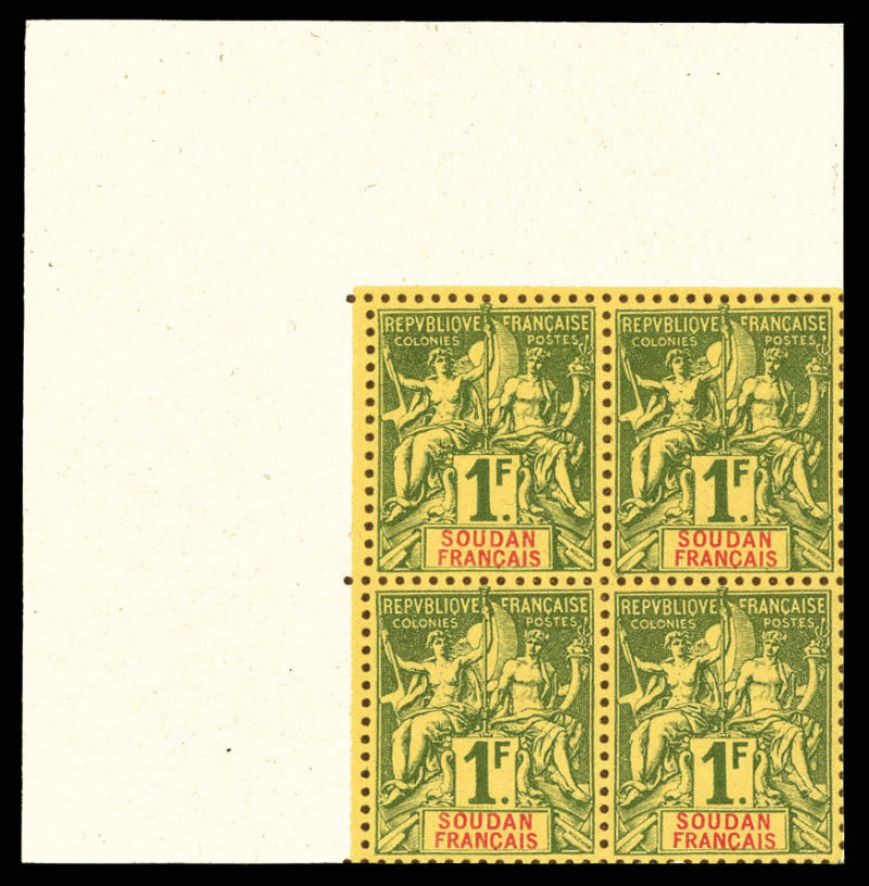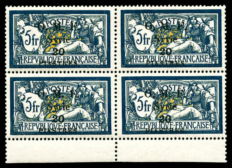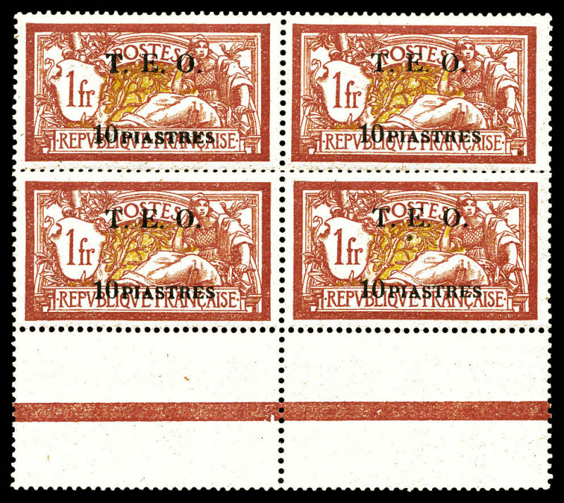4096 imageN°10, 10 piastres sur 1f lie de vin et olive, bloc de quatre bas de feuille, très bon centrage, fraîcheur postale. SUP (certificat) Qualité: ** Cote: 1320 euros (Image)