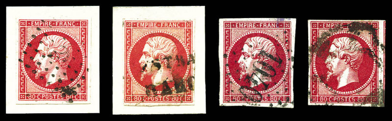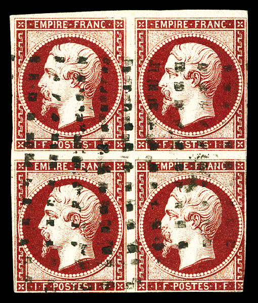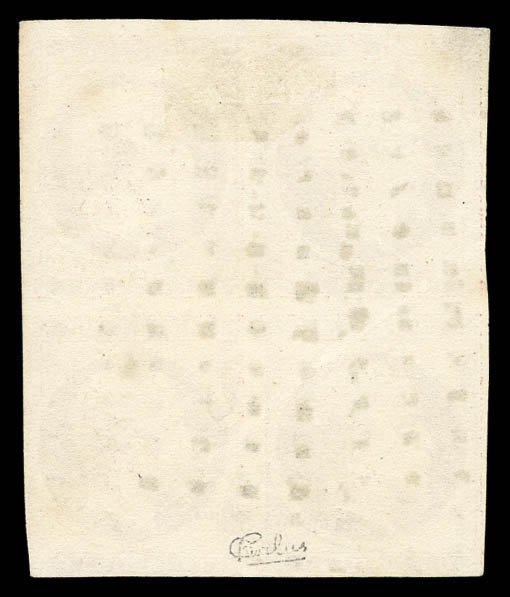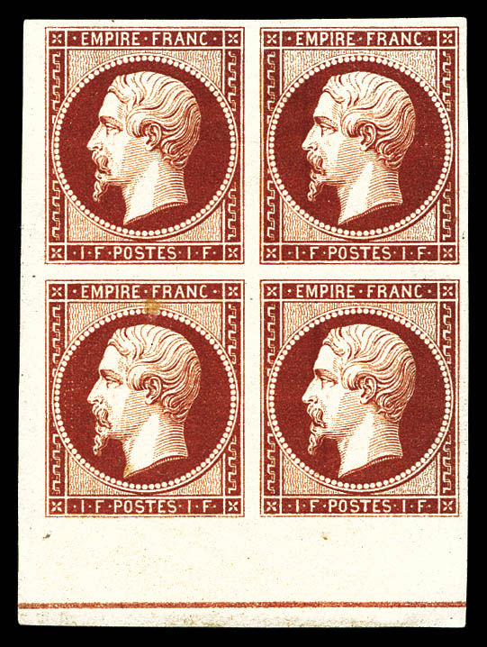 nuance foncée, bloc de quatre coin de feuille avec filet d'encadrement (1exemplaire **), paille dans le papier d'un ex mais très belles marges et fraîcheur postale, un des plus beaux blocs de quatre connus. GRANDE RARETE DE LA PHILATELIE FRANCAISE.