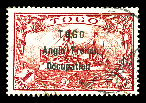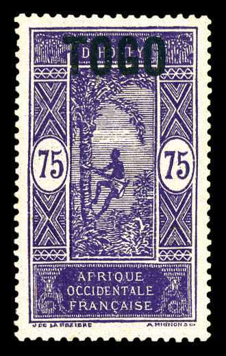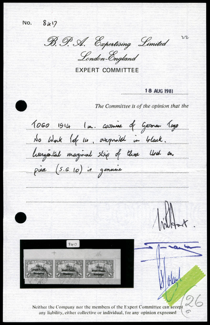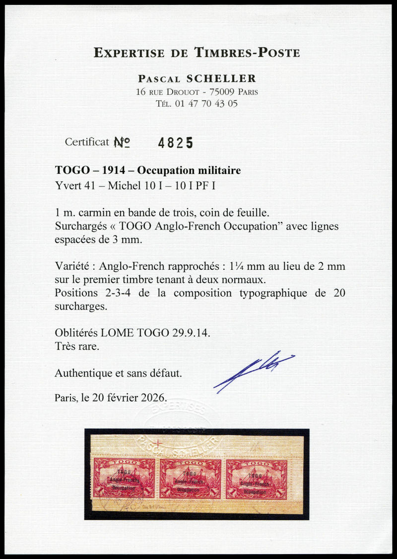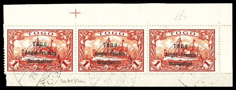 4184 imageN°41, 1 m carmin en bande de trois coin de feuille avec croix de repère, surchargé 'TOGO Anglo-French Occupation' avec lignes espacées de 3mm. Variété Anglo-French rapprochés: 1 1/4 mm au lieu de 2 mm sur le premier timbre tenant à deux normaux. SUPERBE. R.R.R. (signé Scheller/certificats) (N°Michel 10 I) Qualité: Oblitéré Cote: 18000 euros (Image) (image2) (image3) (All Images)