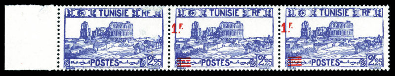 4197 imageN°226e, 1f sur 2f 25 outremer: 2 exemplaires surcharges déplacées à gauche tenant à exemplaires sans surcharge en bande de 3 bdf. TTB (signé Calves/certificat) Qualité: ** Cote: 685 euros (Image)