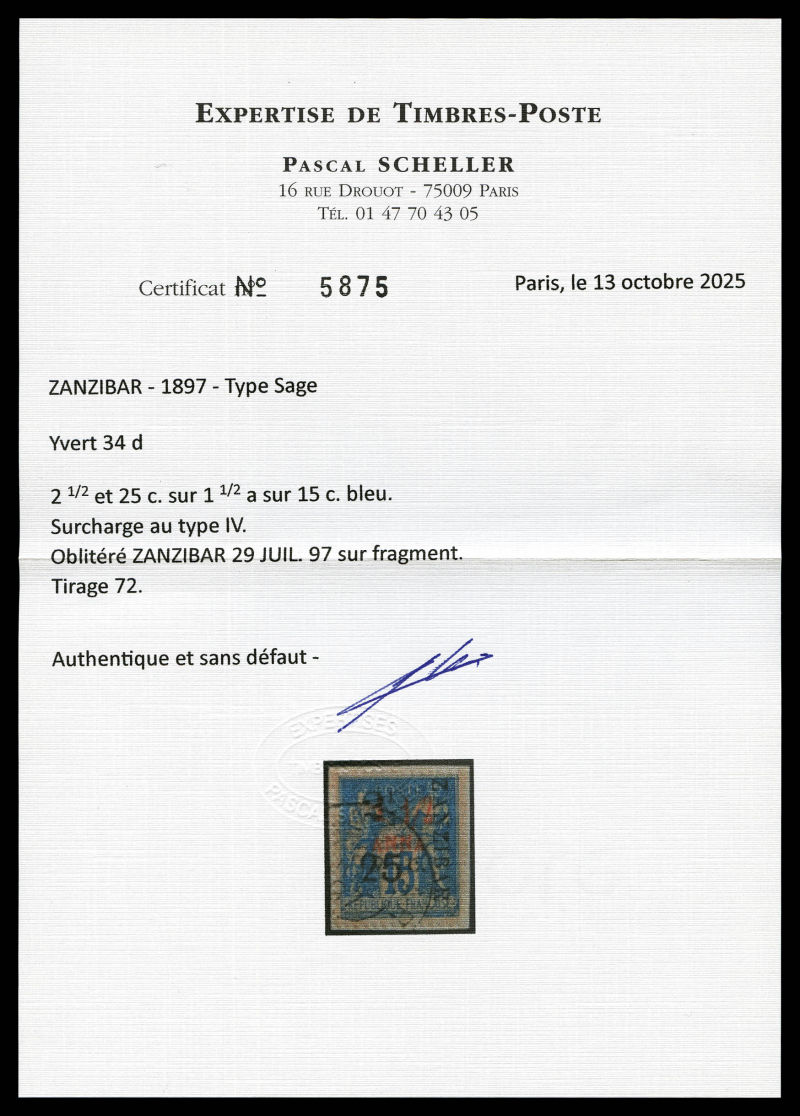 4221 imageN°34d, 2 1/2 et 25c sur 1 1/2 a. TYPE IV sur son support, tirage 72, SUP (signé Scheller/certificats) Qualité: Oblitéré Cote: 1350 euros (Image) (image2) (image3) (All Images)