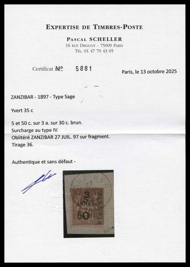 4226 imageN°35c, 5 et 50c sur 3a sur 30c brun type IV sur son support, tirage 36. TTB. R. (signé Scheller/certificats) Qualité: Oblitéré Cote: 1250 euros (Image) (image2) (image3) (All Images)