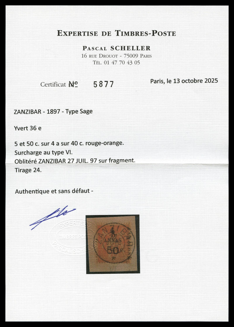 4230 imageN°36e, 5 et 50c sur 4a sur 40c rouge-orange type VI sur son support, tirage 24. SUP. R. (signé Scheller/certificats) Qualité: Oblitéré Cote: 1575 euros (Image) (image2) (image3) (All Images)