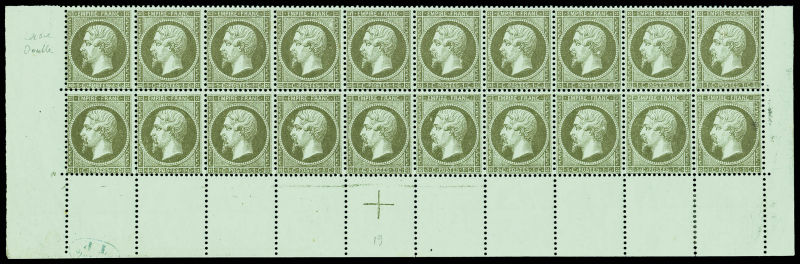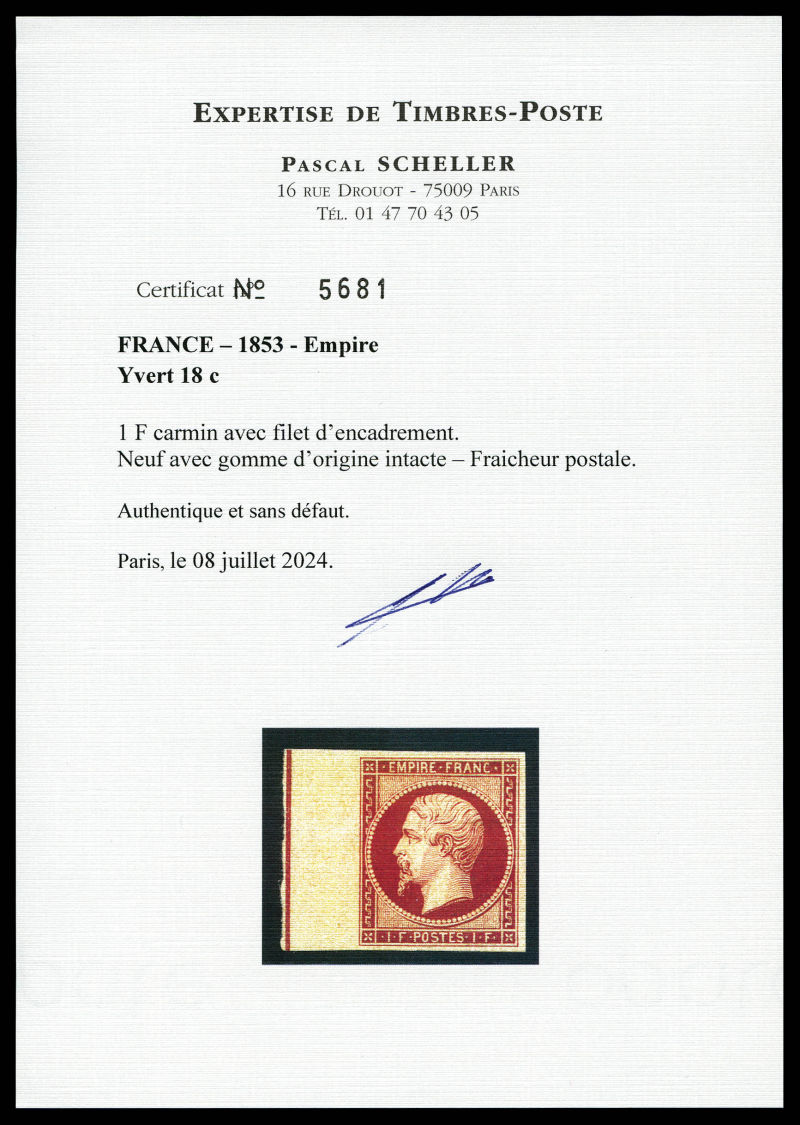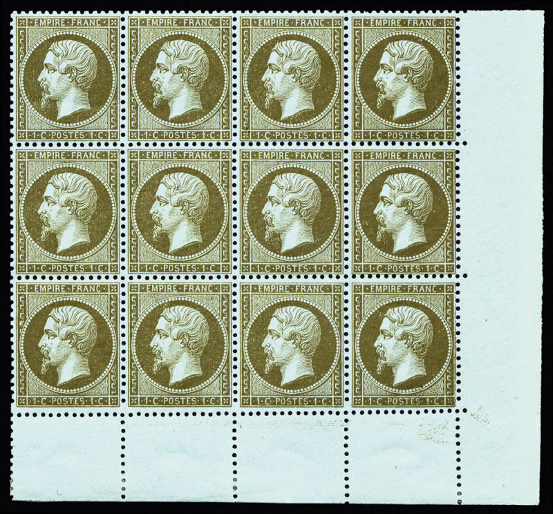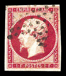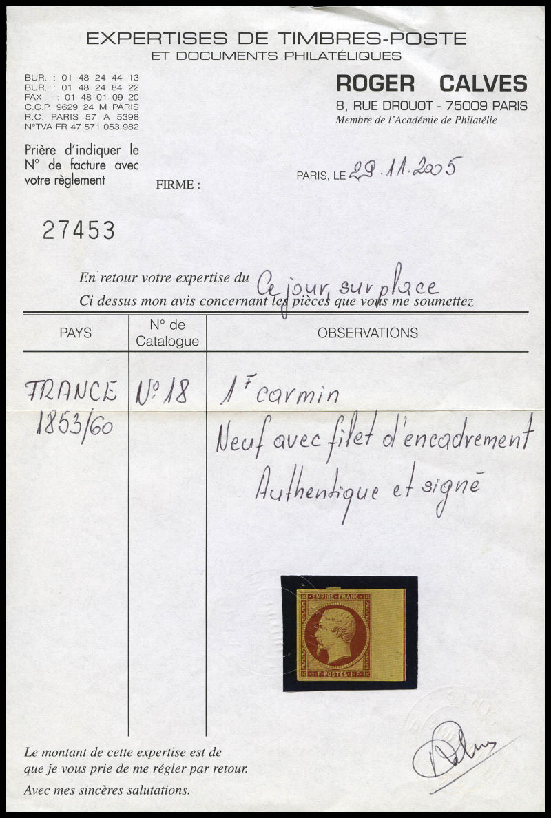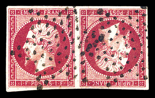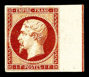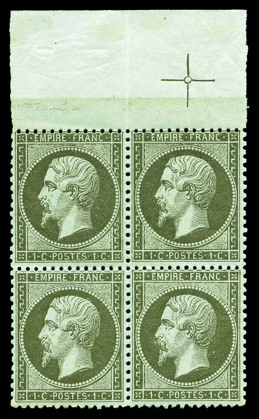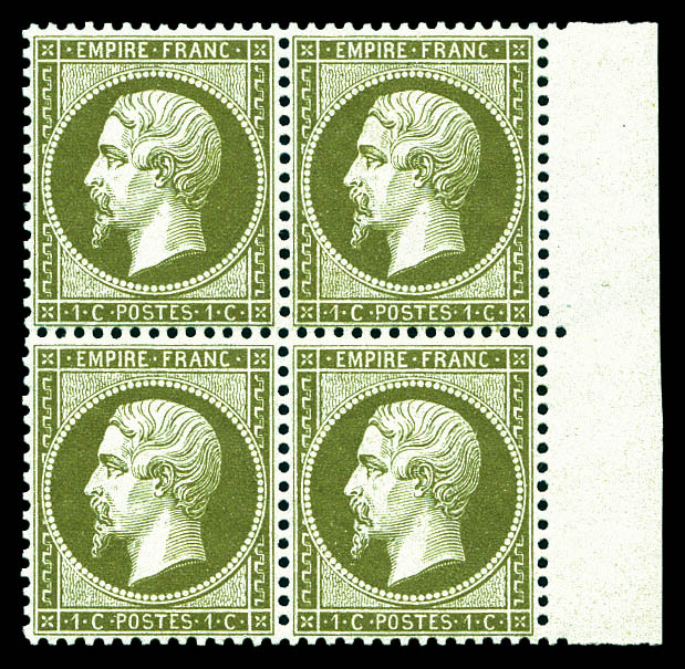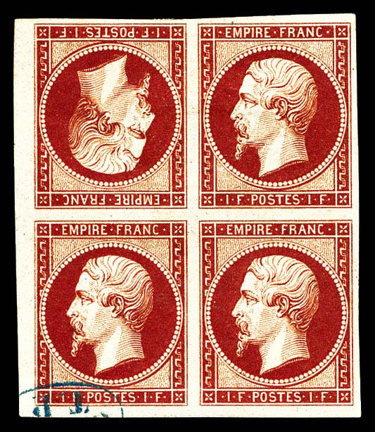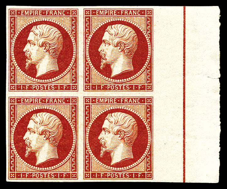 carmin, bloc de quatre, bord de feuille latéral avec filet d'encadrement (les 2 exemplaires du haut chernière légère), marges et couleur exceptionnelles, fraîcheur postale, SUPERBE. R.R.R. (certificats) Qualité: ** (Image) (image2)