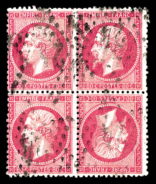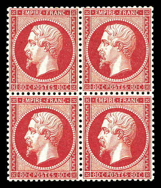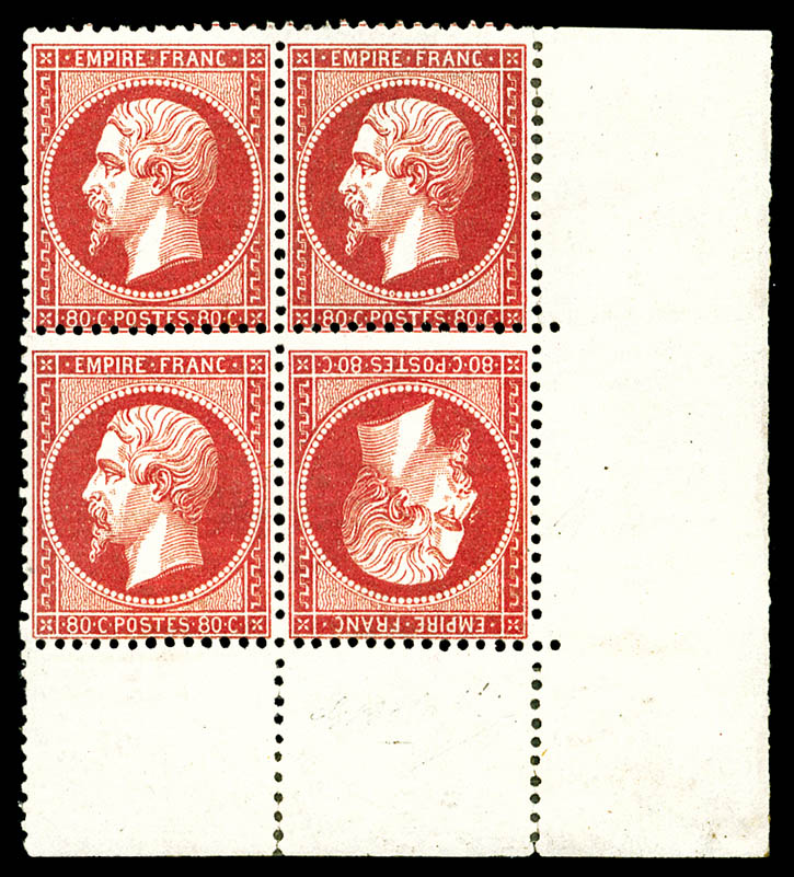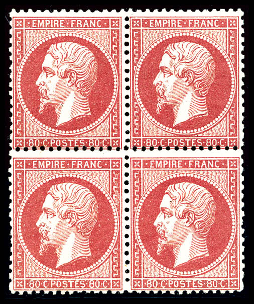 509 imageN°24b, 80c rose, tête-bêche tenant à normaux en bloc de quatre coin de feuille, grande rareté de la philatélie Francaise. MAGNIFIQUE (signé Calves/Brun/certificats) Qualité: ** (Image)