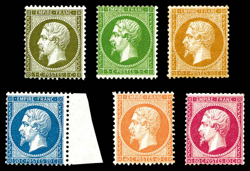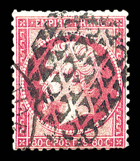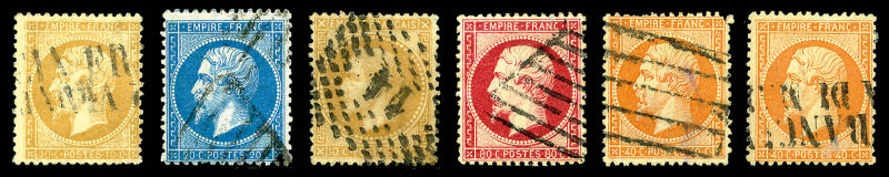 517 imageEmpire dentelé: Ensemble d'oblitérations sur 6 exemplaires dont grille de Livourne, de Civita-Vecchia, chiffre 14, SUP (certificat) Qualité: Oblitéré (Image)