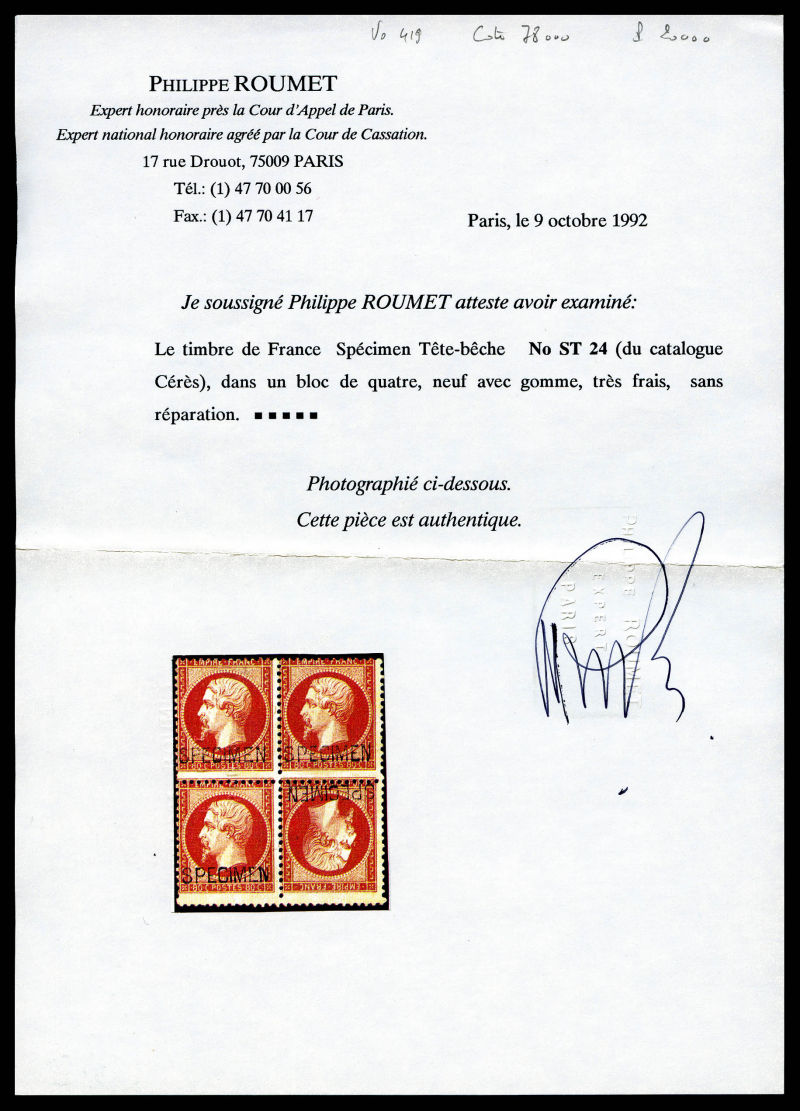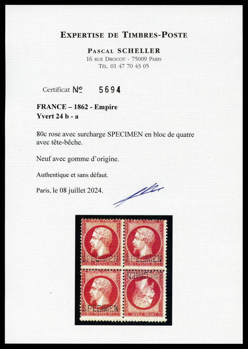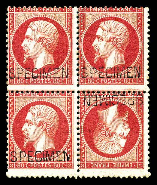 511 imageN°24ba, 80c rose surchargé 'SPECIMEN': tête-bêche tenant à normaux en bloc de quatre. PIECE EXCEPTIONNELLE. SUPERBE. R.R.R. (signé Brun/Calves/certificats) Qualité: * (Image) (image2) (image3) (All Images)