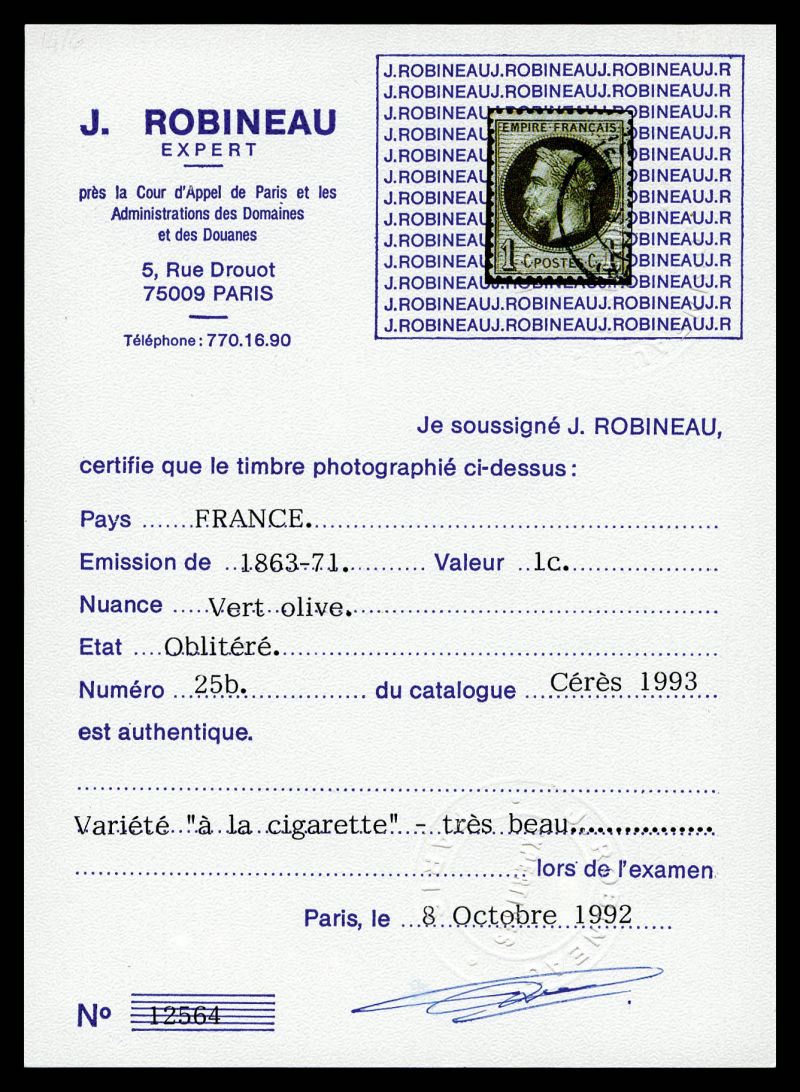 521 imageN°25b, 1c bronze, variété 'à la cigarette', jolie pièce, SUP (certificats) Qualité: Oblitéré Cote: 1450 euros (Image) (image2) (All Images)