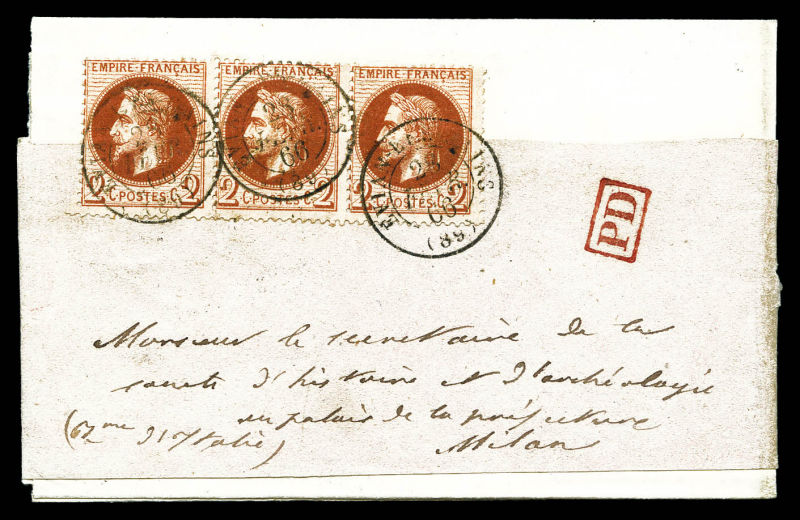 528 imageN°26, 2c Lauré en bande de 3 obl càd d'EVIAN LES BAINS du 28 fevrier 1866 sur bande journal pour Milan. SUP (certificat) Qualité: Oblitéré (Image)