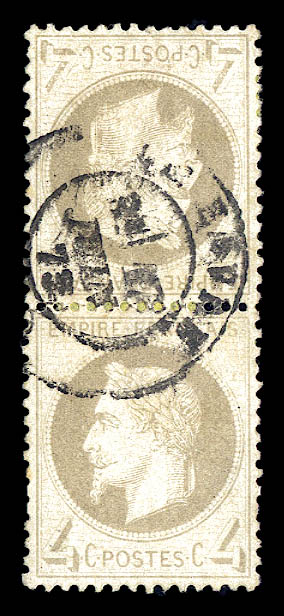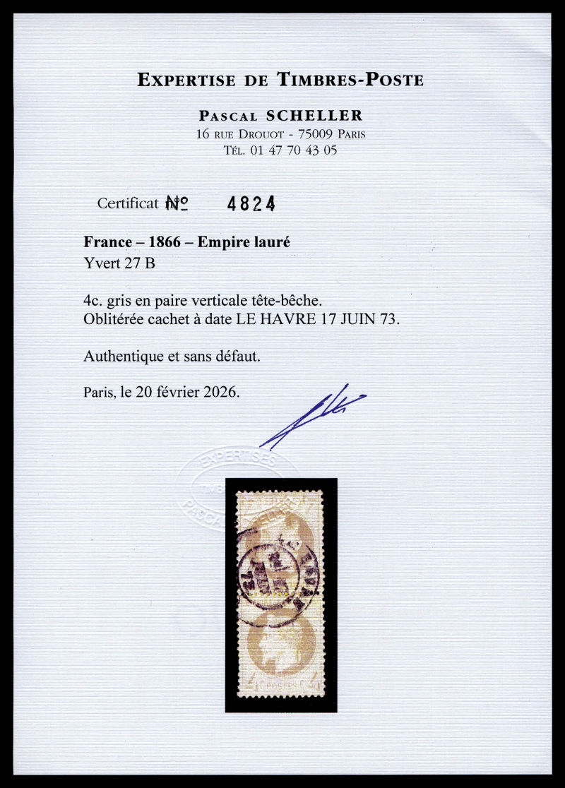 541 imageN°27B, 4c gris en paire tête-bêche obl càd LE HAVRE, très bon centrage. TTB. R.R. (signé Brun/Calves/certificats) Qualité: Oblitéré Cote: 20000 euros (Image) (image2) (All Images)