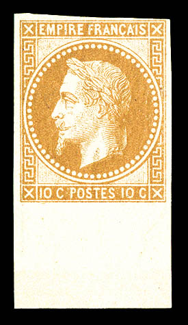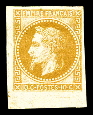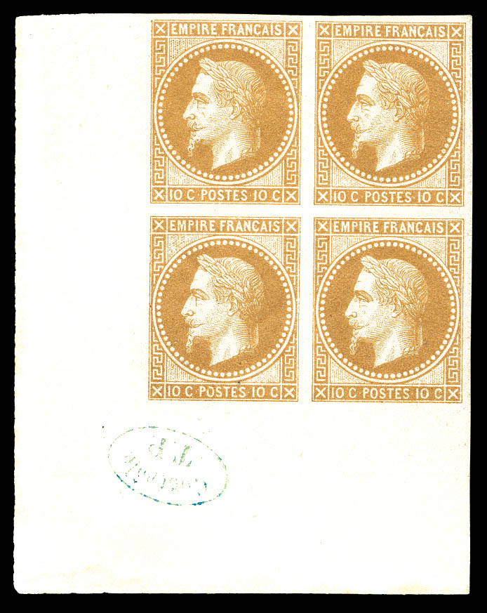 553 imageN°28Aa, 10c bistre impression de Rothschild coin de feuille intégral avec cachet de contrôle 'TP' en bleu (2ex*), fraîcheur postale. SUP. R. (certificat) Qualité: ** (Image)