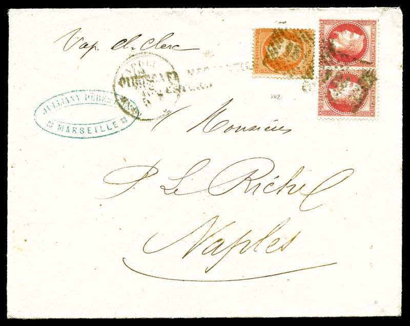 603 image40c Empire Lauré + N°32 80c rose PAIRE obl GC Italien 184 à l'arrivée sur Enveloppe de Marseille, càd NAPOLI 12.5.68, PIROSCAFI MERCANTILE ESTERO, Rare Afft à 2f. SUP (certificat) Qualité: Oblitéré (Image) (image2) (All Images)