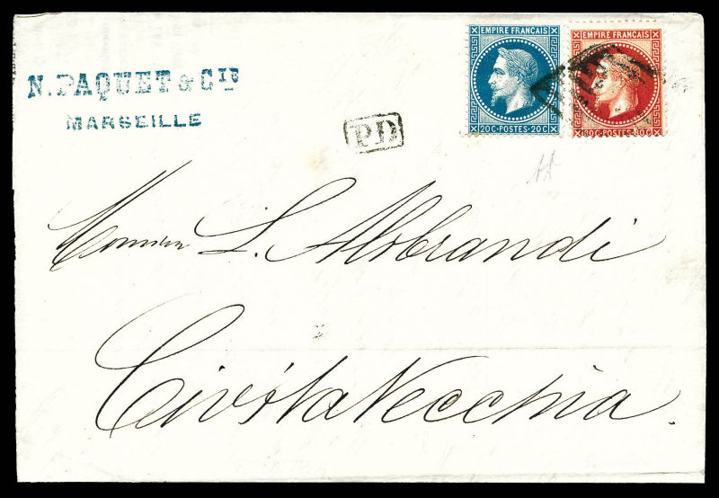 604 imageEmpire Lauré: 20c + 80c oblitération grille de Civita Vecchia sur lettre double port. SUPERBE. R. (certificat) Qualité: Oblitéré (Image) (image2) (All Images)