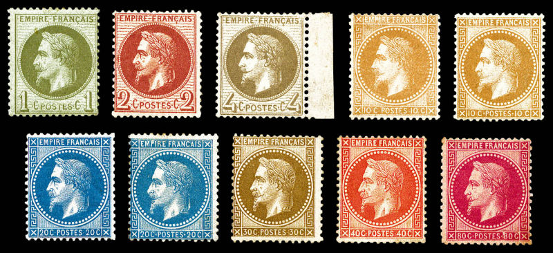 609 imageEmpire Lauré: N°25, 26A, 27B, 28A, 28B, 29A, 29B, 30, 31 et 32, les 10 valeurs B/TB Qualité: * Cote: 7865 euros (Image)