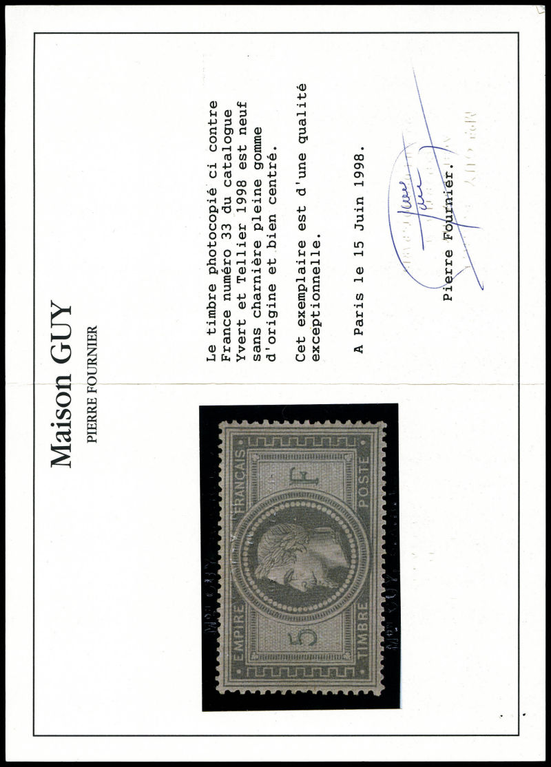 613 imageN°33, Empire, 5F violet-gris, très bon centrage. SUP. R. (signé/certificats) Qualité: * Cote: 9500 euros (Image) (image2) (All Images)