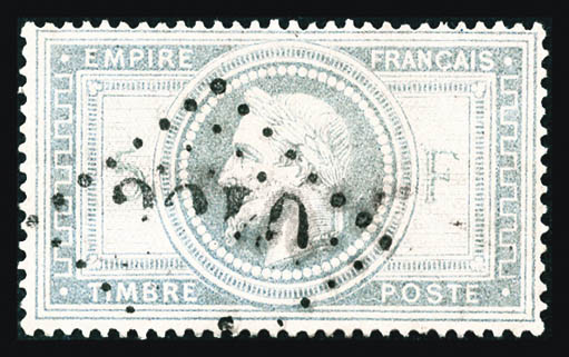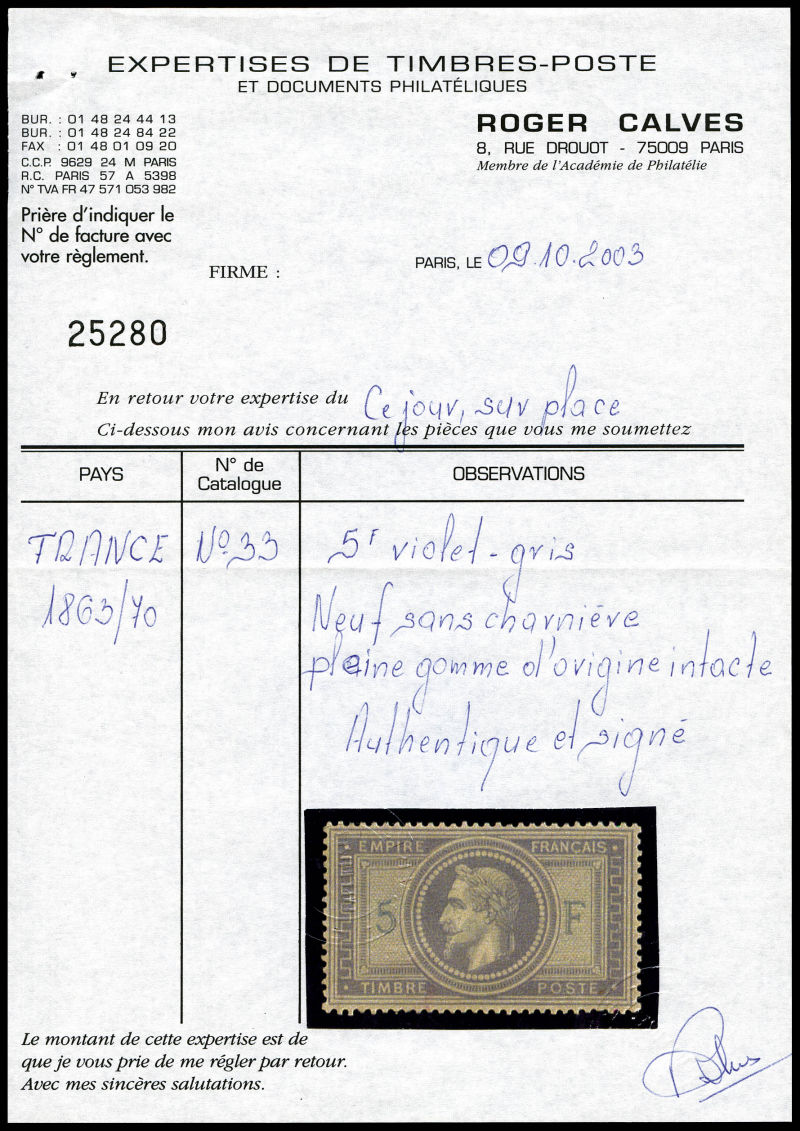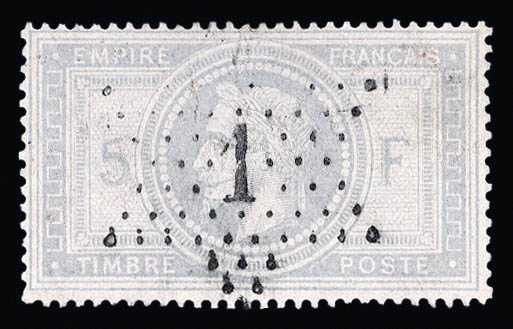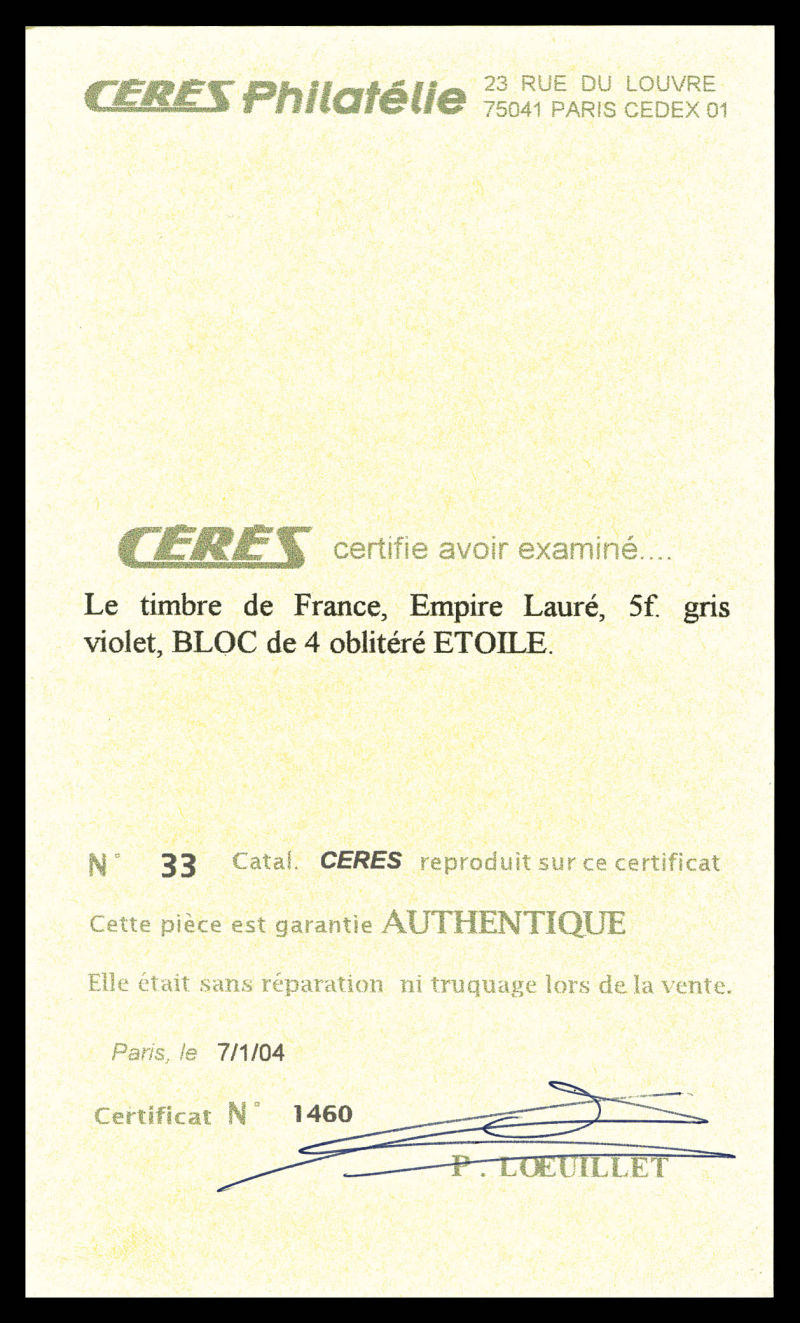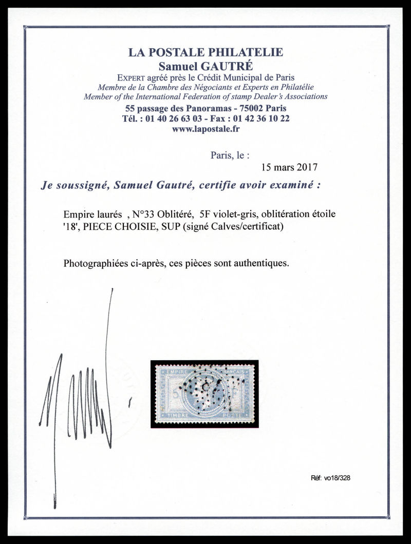 619 imageN°33, Empire, 5F violet-gris, oblitération étoile '1' posée, TTB. (signé Scheller/Calves/certificat) Qualité: Oblitéré Cote: 1200 euros (Image) (image2) (All Images)