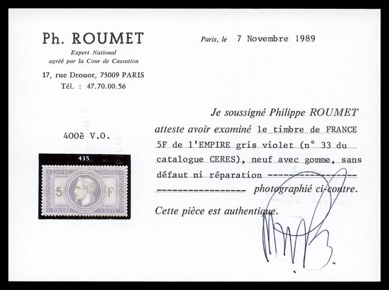 620 imageN°33, 5F Empire, violet gris, GC '2240', TB (certificat) Qualité: Oblitéré Cote: 1200 euros (Image)