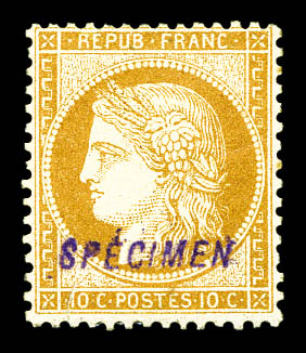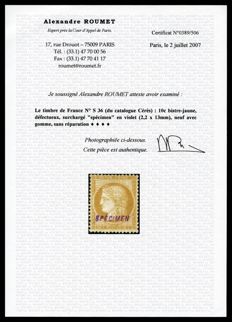 683 imageN°36, 10c bistre surchargé SPECIMEN en violet. pli, belle présentation. R. (signé Calves/certificat) Qualité: * (Image) (image2) (All Images)
