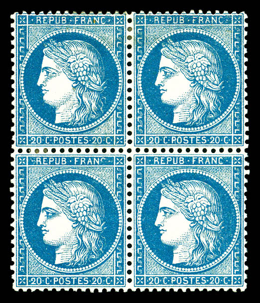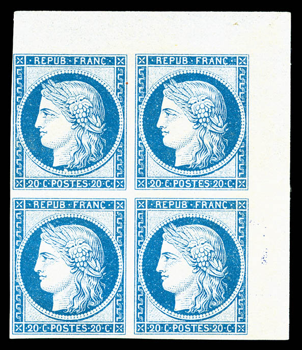 691 imageN°37f, 20c bleu IMPRESSION DE GRANET non dentelé en bloc de quatre coin de feuille, SUPERBE (certificat) Qualité: * (Image)
