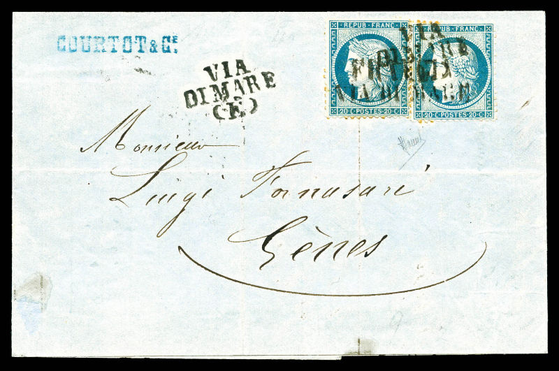 687 imageN°37, 1871, 20c Siège x 2ex obl VIA DI MARE (I) en noir, les utilisations tardives des anciennes marques d'entrées Sardes sont rares. SUPERBE (certificat) Qualité: Oblitéré (Image) (image2) (All Images)