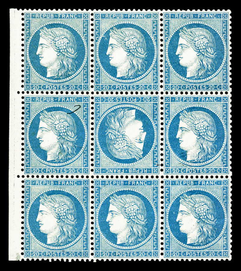 690 imageN°37d, 20c bleu sur papier jaunâtre, tête-bêche au centre d'un bloc de neuf bord de feuille, exceptionnelle fraîcheur, centrage parfait. PIECE SPLENDIDE (signé Calves/certificat) Qualité: ** (Image)