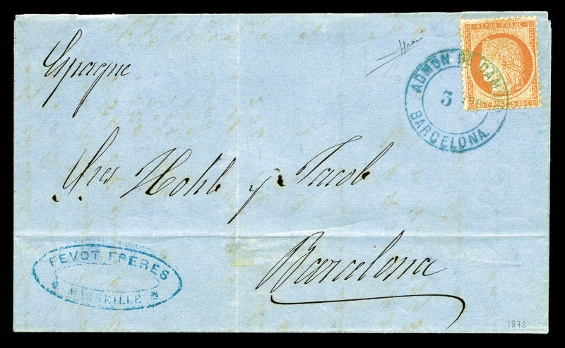 699 imageN°38, 40c Siège obl Càd bleu 'ADMON DE CAMBIO' sur lettre de Marseille du 16 mars 1872 pour Barcelone. TTB (certificat) Qualité: Oblitéré (Image) (image2) (All Images)