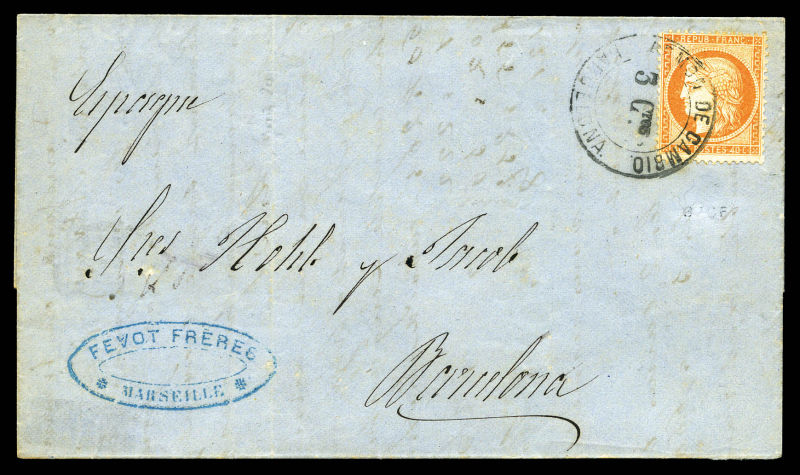 700 imageN°38, 1873, 40c Siège obl cachet rond ADMON DE CAMBIO BARCELONA' 3Cvos/France sur lettre de Marseille. TB Qualité: Oblitéré (Image) (image2) (All Images)