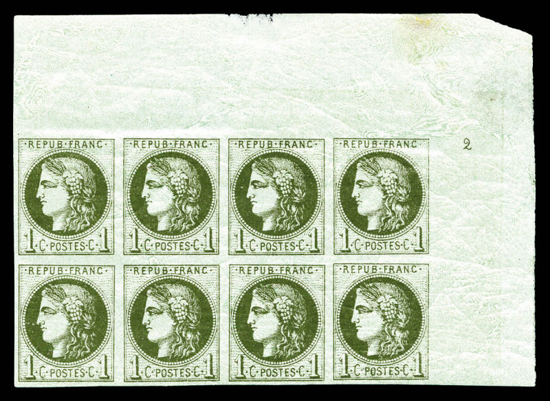 707 imageN°39A, 1c olive Report 1 en bloc de 8 coin de feuille avec chiffre '2' en marge (3ex du bas*), très jolie pièce. SUP. R. (certificat) Qualité: ** (Image)