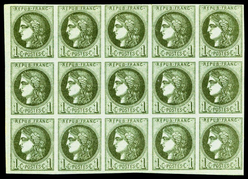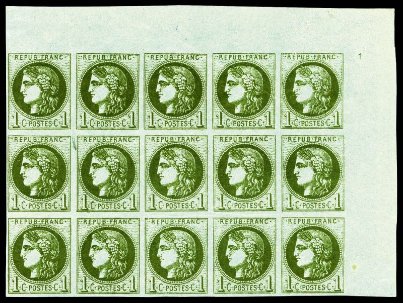719 imageN°39B, 1c olive Report 2 en bloc report complet de 15 exemplaires coin de feuille avec petit chiffre '1', FRAÎCHEUR POSTALE, RARE ET SUPERBE (certificats) Qualité: ** (Image)