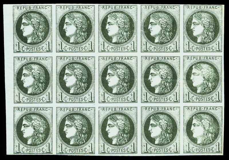 713 imageN°39Aa, 1c olive très foncé Report I, bloc report de 15 exemplaires, bord de feuille latéral gauche, FRAÎCHEUR POSTALE, SUPERBE (signé Calves/certificat) Qualité: ** (Image)