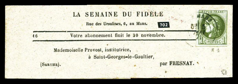 717 imageN°39Aa, 1c olive foncé Report I obl càd du MANS le 5 mai 70 sur bande journal 'LA SEMAINE FIDELE'. TTB (signé/certificat) Qualité: Oblitéré Cote: 2050 euros (Image)
