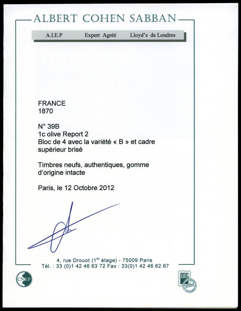 720 imageN°39B, 1c olive Rep 2, bloc de quatre avec variété 'B' et cadre supérieur brisé, fraîcheur postale. SUP (certificats) Qualité: ** (Image) (image2) (All Images)