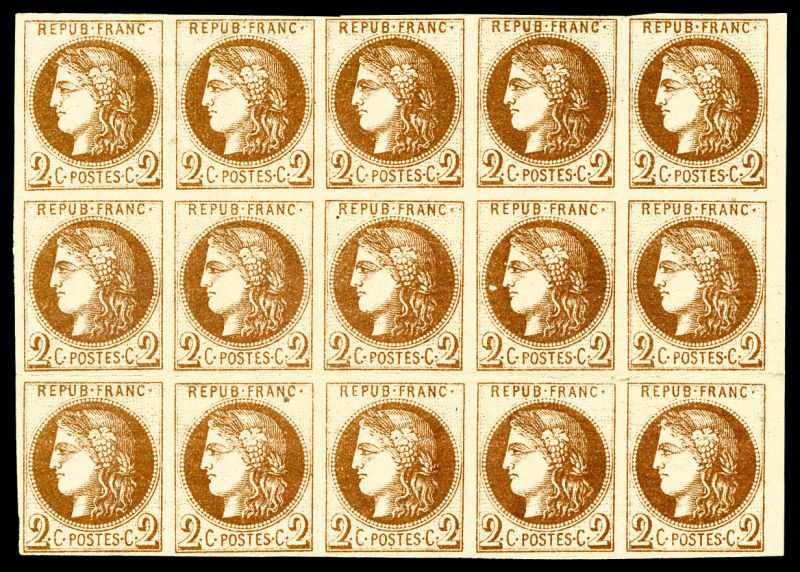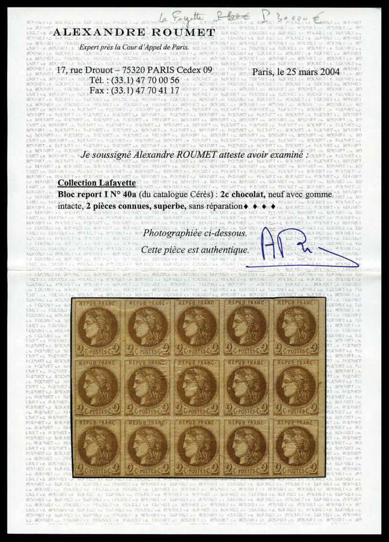 741 imageN°40A, 2c chocolat clair Report I, bloc de 15 exemplaires (8ex *), le plus beau des deux bloc reports connus. SUPERBE. R.R.R. (signé/certificats) Qualité: ** (Image) (image2) (All Images)