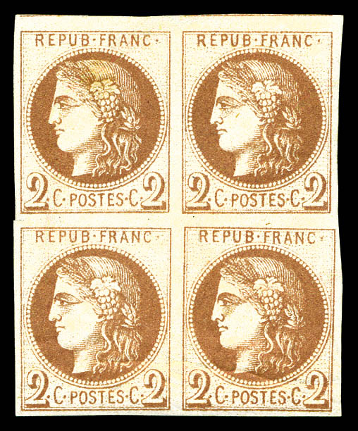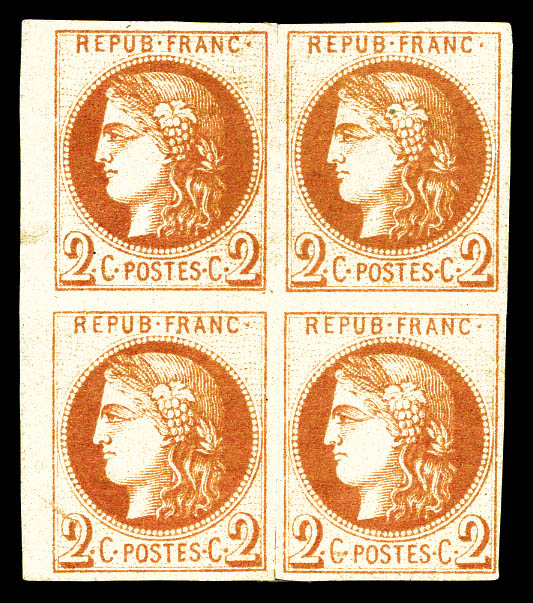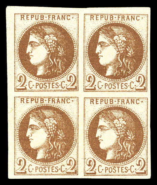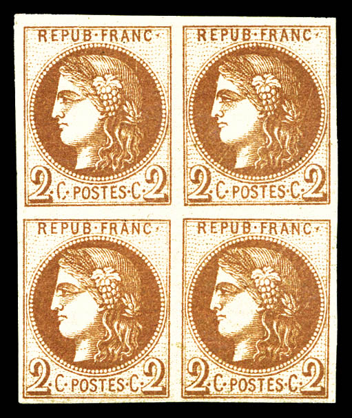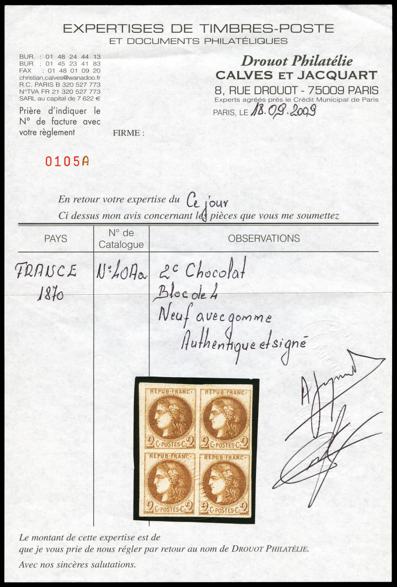 757 imageN°40Ad, 2c chocolat clair Report 1, impression fine de Tours en bloc de quatre bord de feuille latéral, TB. R.R.R, (signé Calves/certificat) Qualité: * Cote: 11000+ euros (Image)