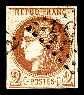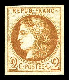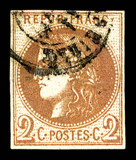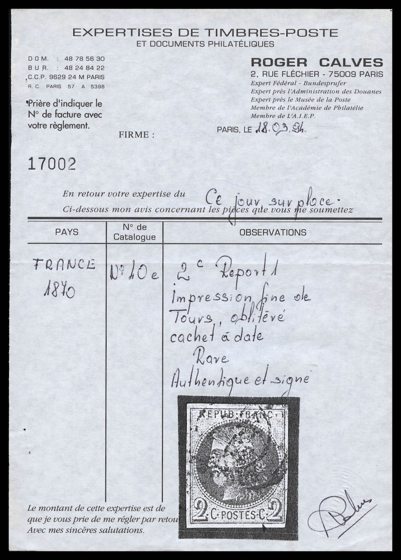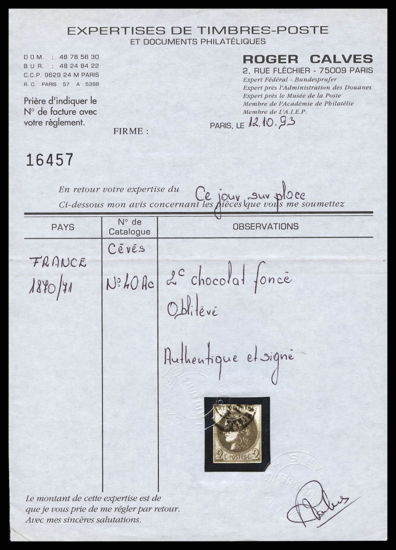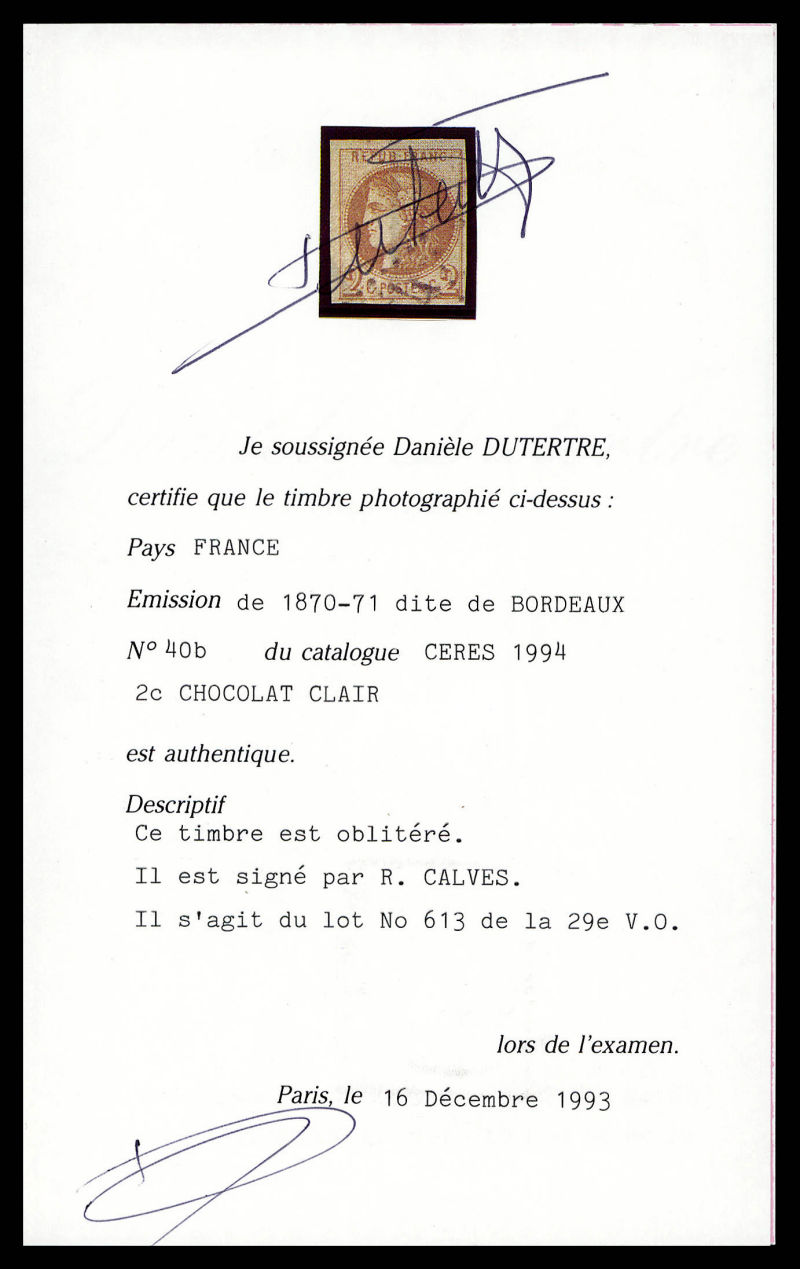 759 imageN°40Ad, 2c chocolat clair Report 1, impression très fine dite de Tours obl càd de Bordeaux, rare en oblitéré. TTB. (signé Calves/certificats) Qualité: Oblitéré Cote: 6000 euros (Image) (image2) (All Images)