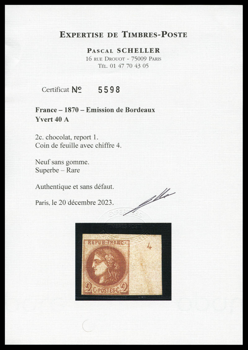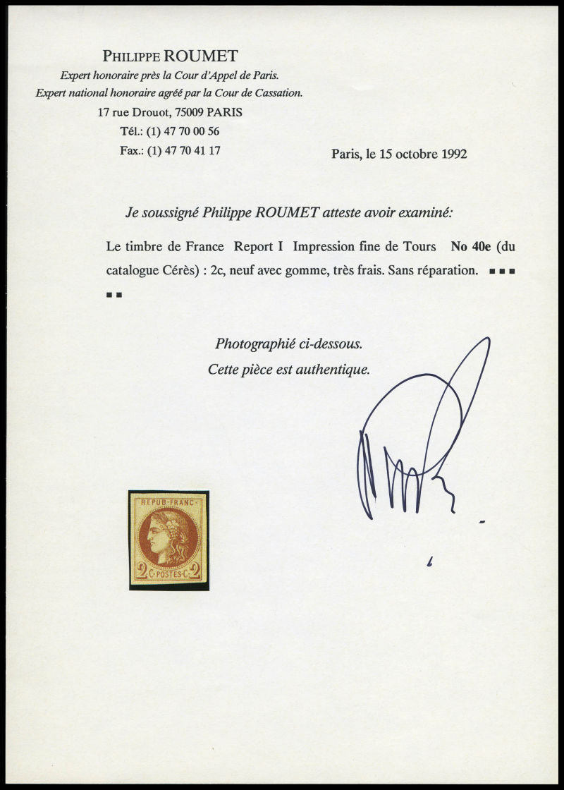 758 imageN°40Ad, 2c chocolat clair Report 1, impression très fine dite de Tours, quatre marges équilibrées, RARE et SUP (signé/certificats) Qualité: * Cote: 2750 euros (Image) (image2) (All Images)