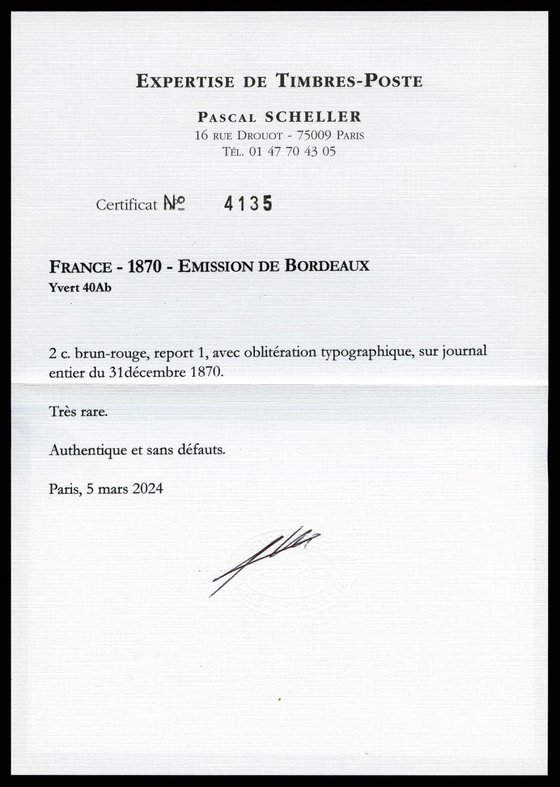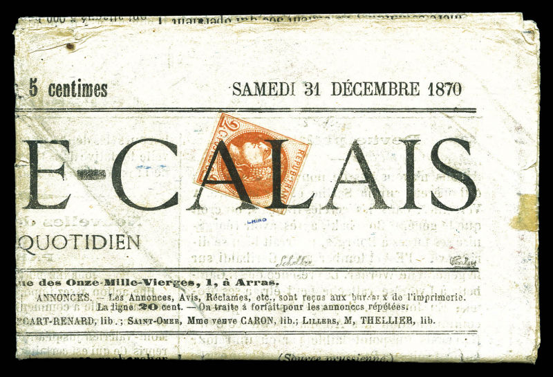 753 imageN°40Ab, 2c brun-rouge Report 1 obl typographique sur journal complet 'Le Pas de Calais' du 31 décembre 1870, 2 pièces connues. SUPERBE. GRANDE RARETEE. (signé Margues/Calves/Scheller/certificats) Qualité: Oblitéré Cote: 50000 euros (Image) (image2) (All Images)