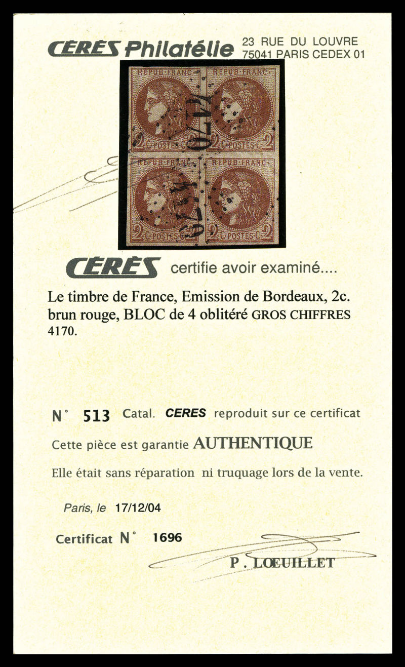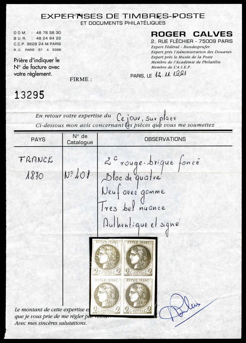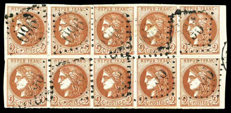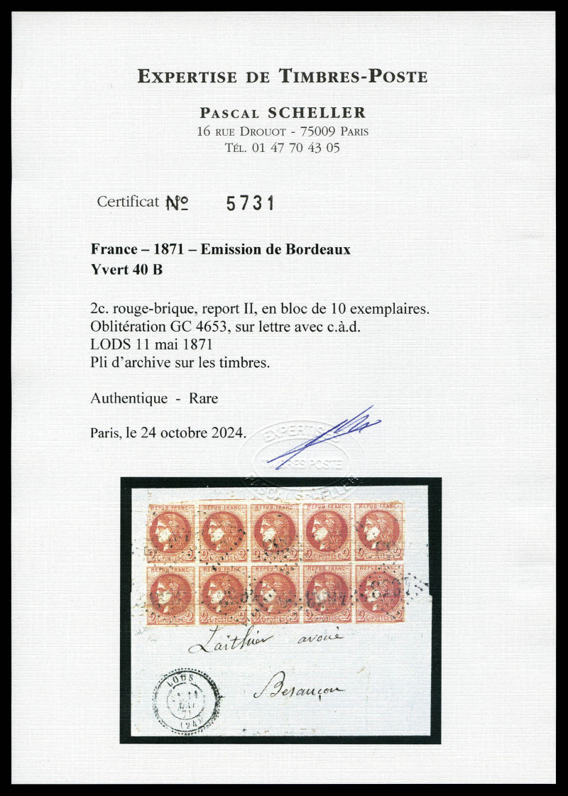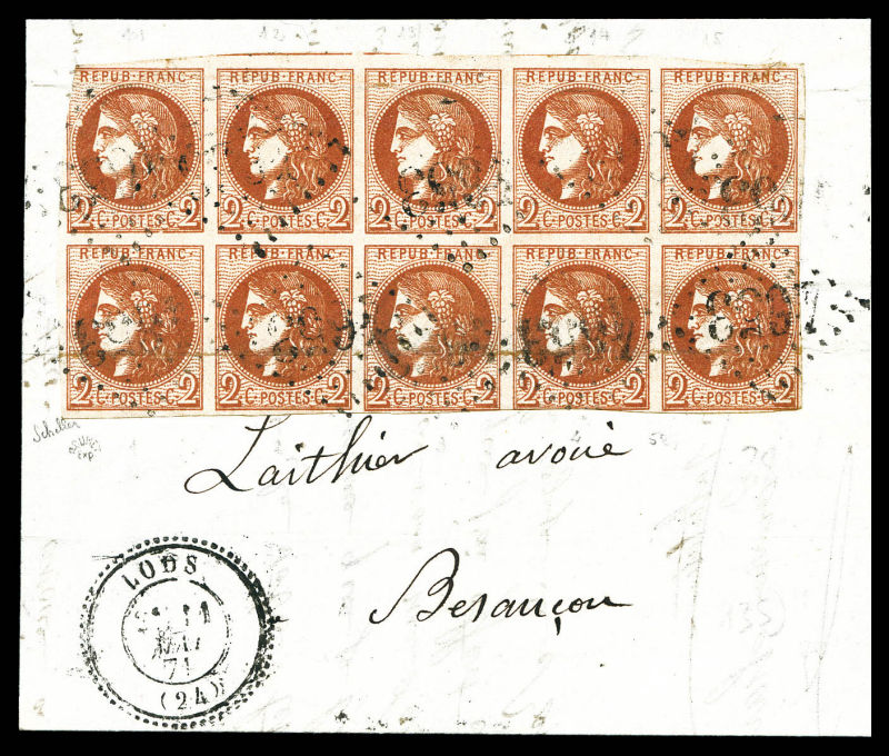 brun-rouge Report 2, bloc de dix exemplaires (déf.) obl. GC 4653 sur lettre de LODS, Doubs, le 11 mai 1871 pour Besançon, TRES RARE (signé Scheller/certificats) Qualité: Oblitéré (Image) (image2)
