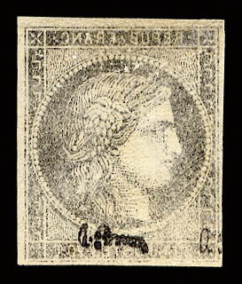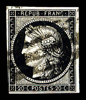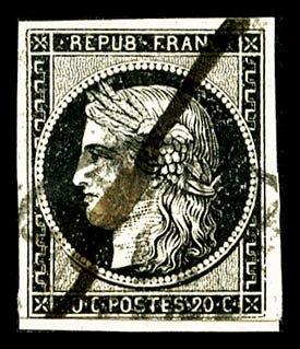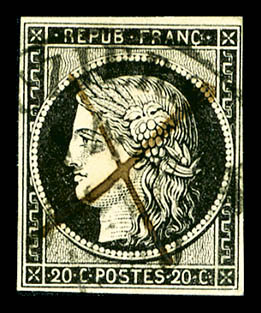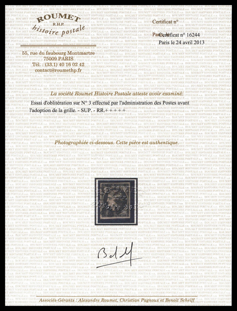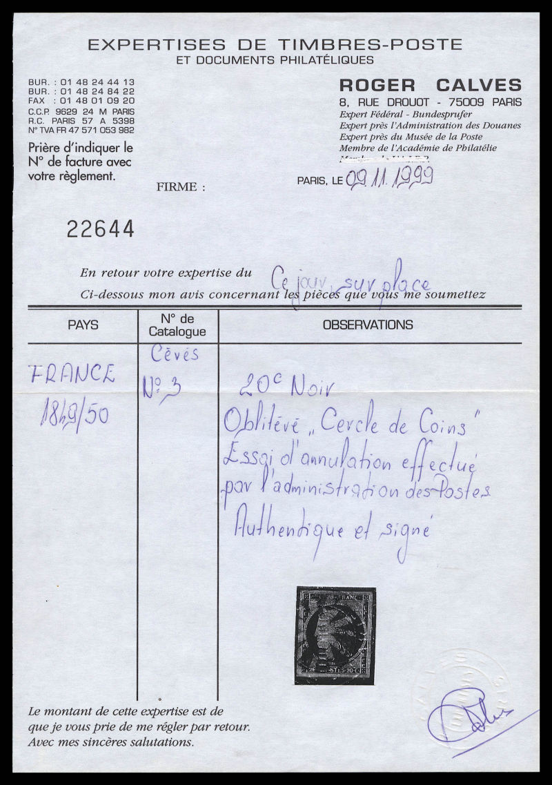 65 imageN°3, 20c noir oblitération 'Cercle de Coins', essai d'annulation effectué par l'administration des Postes avant l'adoption de la grille. SUPERBE. R.R.R. (signé Calves/Jamet/certificat) Qualité: Oblitéré (Image) (image2) (image3) (image4) (All Images)